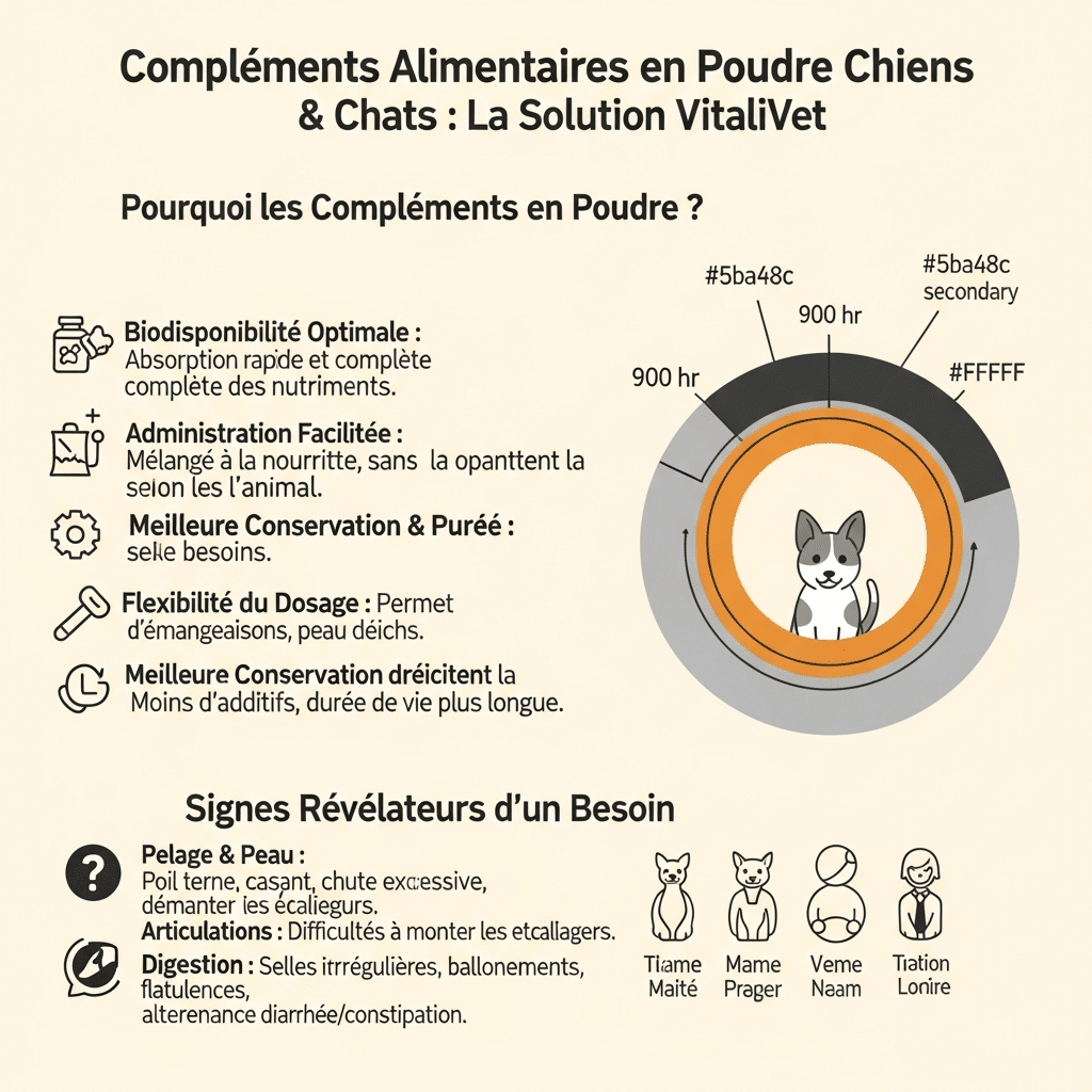 Vous souhaitez offrir le meilleur à votre compagnon à quatre pattes ? Les compléments alimentaires en poudre représentent une solution pratique et efficace pour soutenir sa santé au quotidien. Contrairement aux idées reçues, une alimentation industrielle, même de qualité premium, ne couvre pas toujours l’ensemble des besoins nutritionnels spécifiques de votre animal. Articulations fragilisées, pelage terne, digestion sensible ou système immunitaire affaibli : autant de signaux que votre chien ou chat pourrait bénéficier d’un coup de pouce nutritionnel ciblé. Les compléments alimentaires pour chien et les compléments alimentaires pour chats en poudre se distinguent par leur facilité d’administration et leur excellente biodisponibilité. Mélangés directement dans la gamelle, ils s’intègrent naturellement au repas sans contrainte. Mais comment choisir le bon complément ? Quels sont les réels bénéfices pour votre animal ? Dans cet article, découvrez pourquoi la forme poudre constitue un choix judicieux et comment elle peut transformer durablement la vitalité de votre fidèle compagnon.